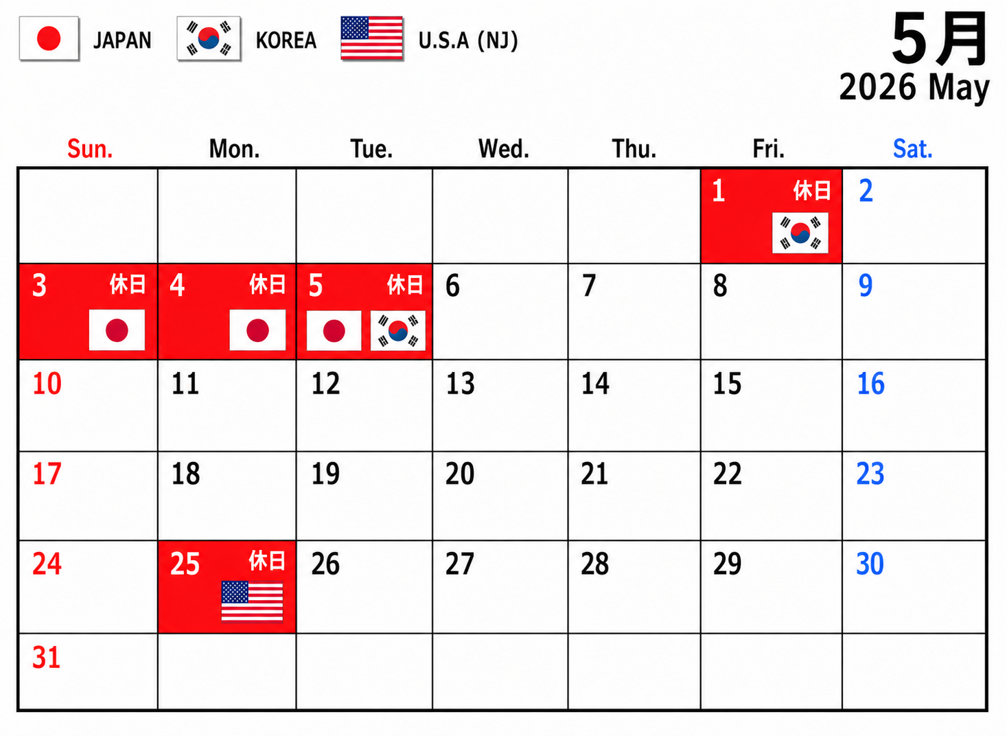 韓国 : 5月1日(金) 労働節 (検品、入庫、集荷、出荷なし)